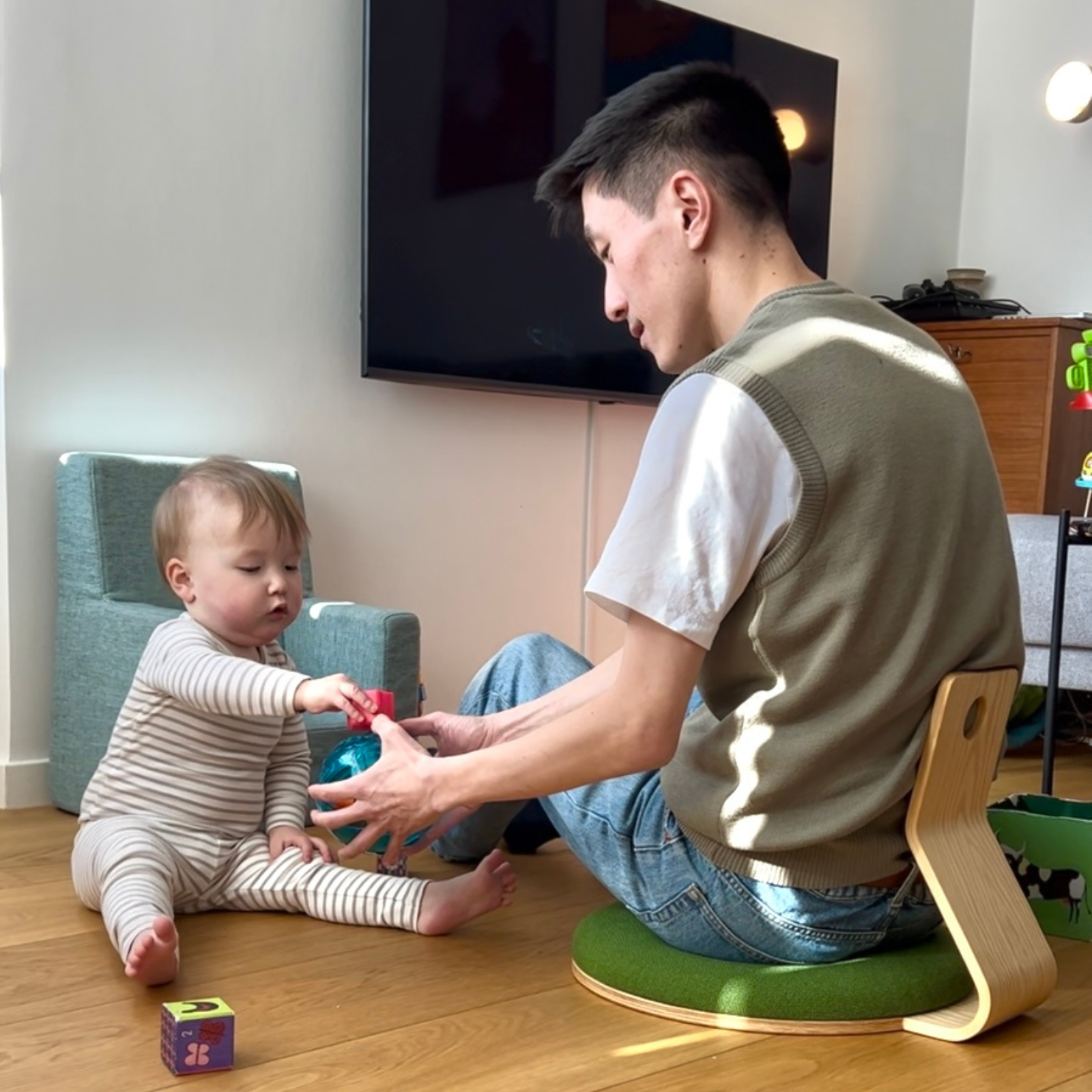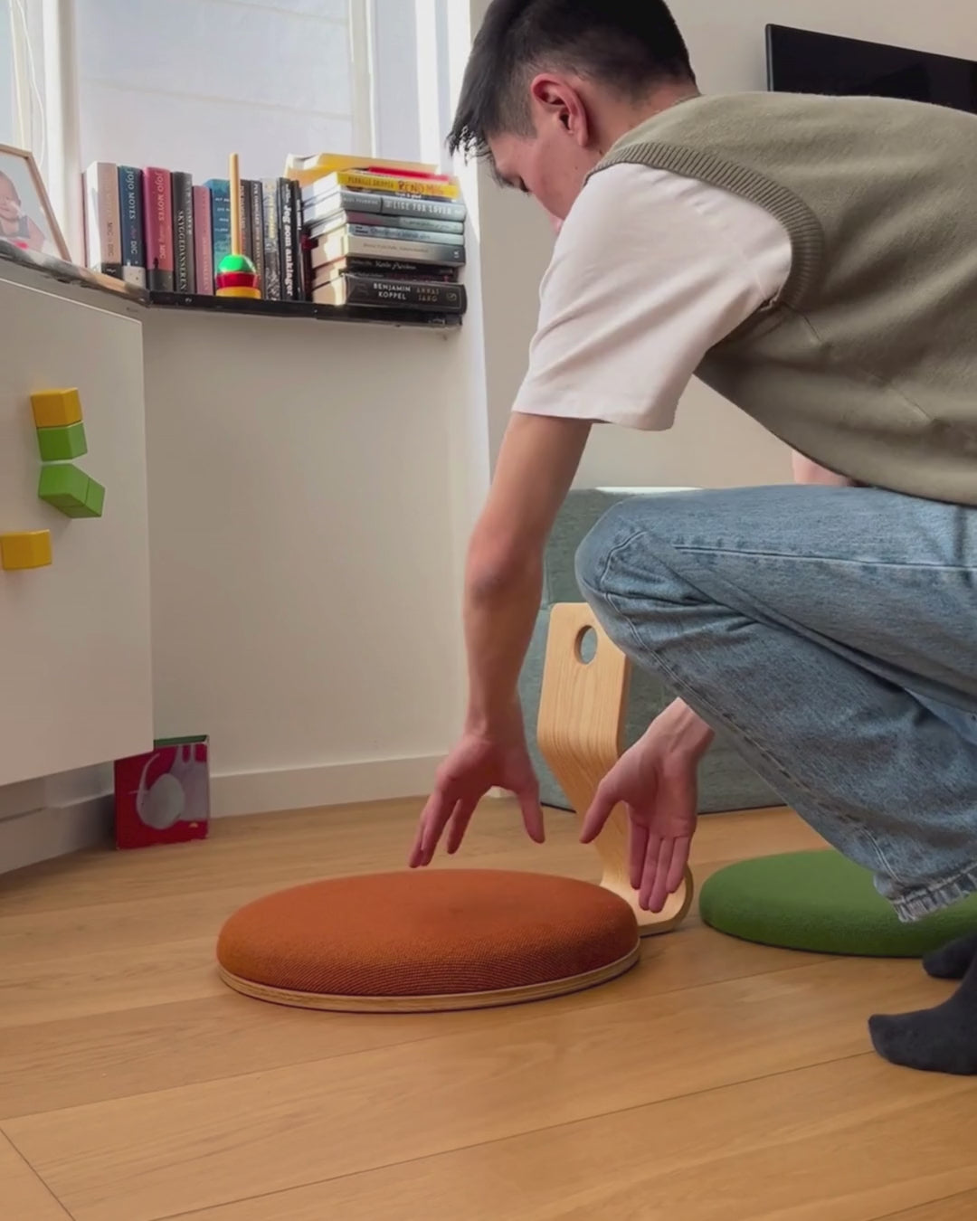 "Jeg har døjet med diskusprolaps og har ikke kunne sidde på gulvet. Med Samu stolen kan jeg nu komme helt ned og lege med min lille pige"